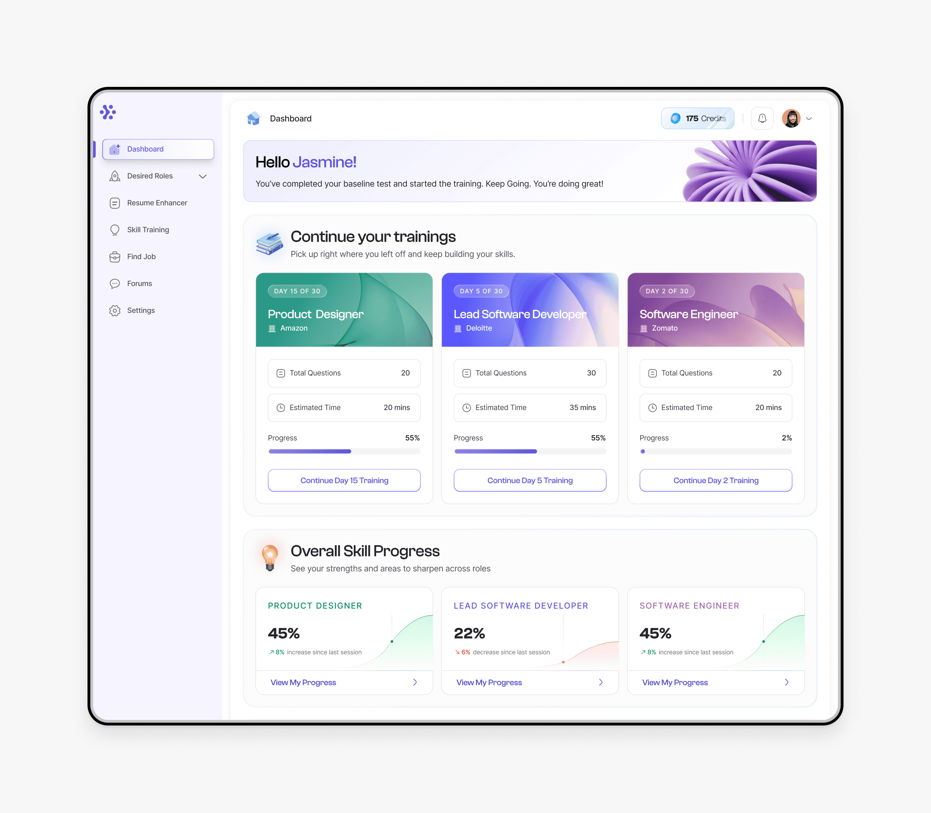 The challenge was to simplify a complex, AI heavy system into clear and actionable experiences. Job seekers typically rely on disconnected tools for learning, resume reviews, and interview practice, which leads to inconsistency and lack of role specific preparation. Careerlift solves this by personalizing the entire journey around the roles users want to pursue, while making AI guidance transparent, supportive, and easy to trust.