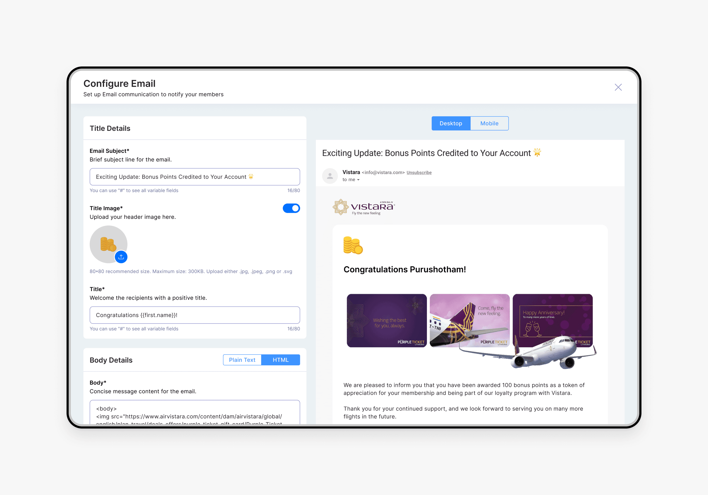 Campaigns: Combine segments, templates and reward rules to run targeted loyalty campaigns. This empowers marketing and relationship teams to activate customers with personalized messages and rewards.