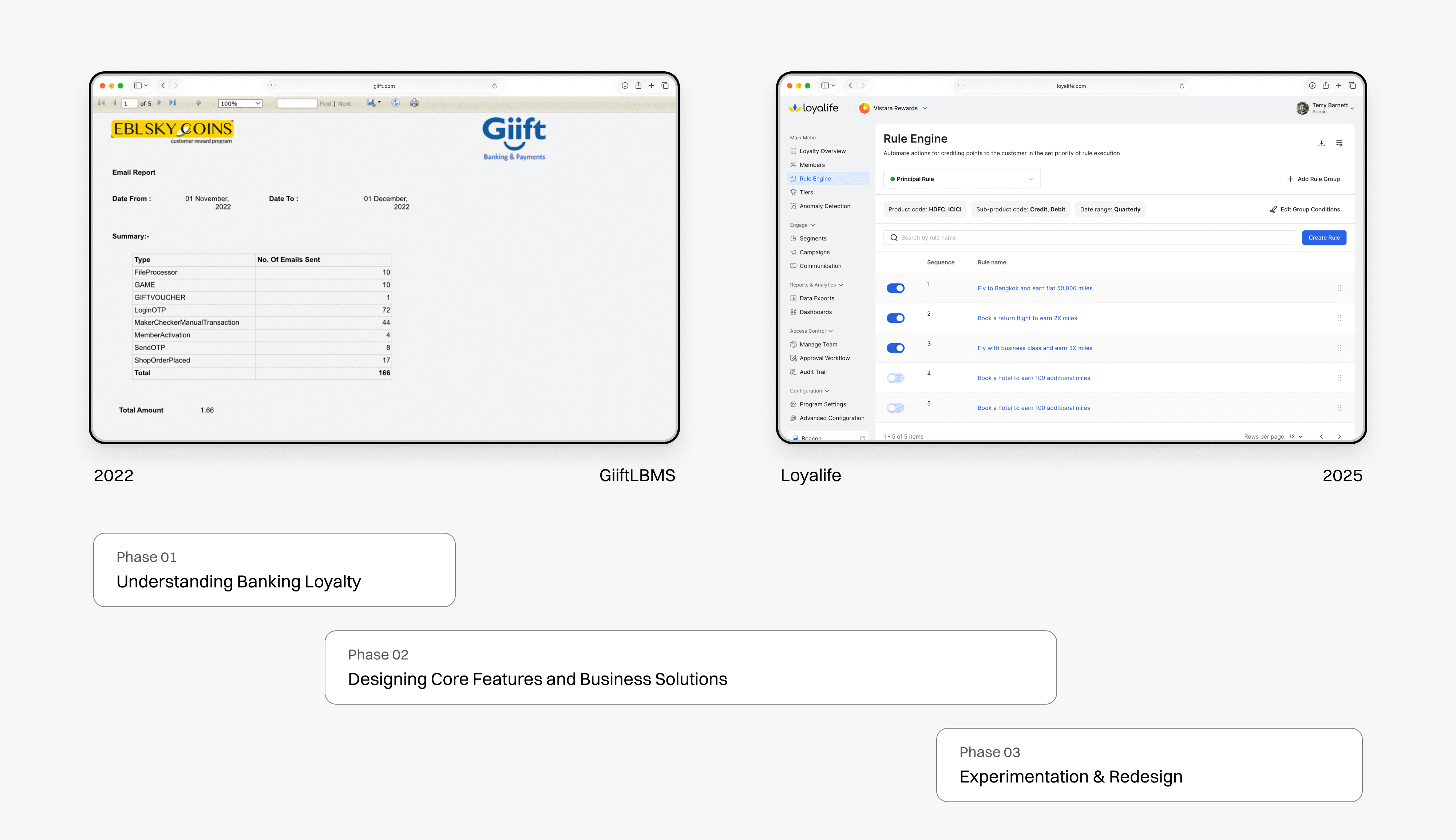 Across three years, I contributed to shaping a platform that helps banks and enterprises transform loyalty into sustained revenue growth. The work combined research, systems thinking and strategic decision making, resulting in a product that is both powerful and easy to use.