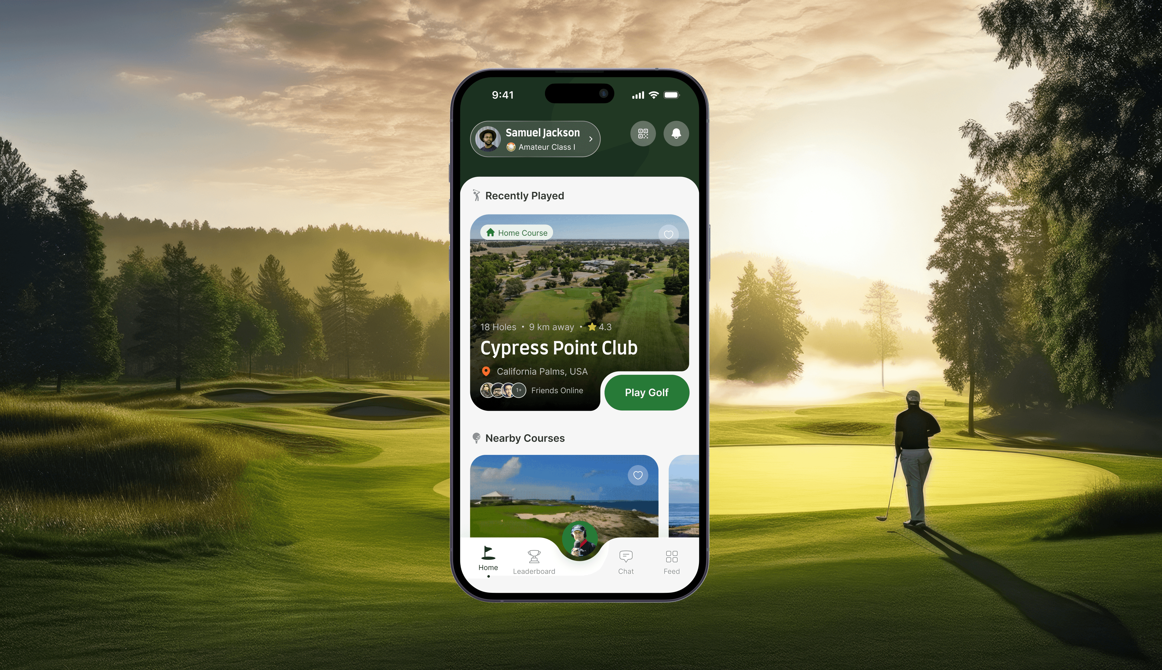 The homepage serves as a dynamic starting point, showing users a curated list of nearby golf courses and upcoming events, while also offering quick access to instantly start a game at their home course. A dedicated QR code section at the top makes it easy to add friends, and a compact profile shortcut ensures users can access their essentials with a single tap. By combining relevant courses, social features, and quick actions, the homepage stays engaging, intuitive, and easy to navigate.
